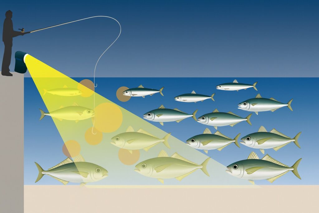 夜は常夜灯にベイトが寄り、効率的に魚を探せますが、光量や色温度、水深、風向で結果が変わります。灯下にベイトが見えるのに食わない時は、光の境界の外縁に仕掛けを通し、速めの誘いから入り、反応で速度を落として同調させます。灯が弱い、または競合者が多い場合は、暗部の筋をなぞるイメージでタナを上から下へ刻み、枝長をやや長くして見切りを減らします。投光器は施設のルール遵守が前提で、照らしすぎはかえって散らすことがあるため、角度と距離を調整します。風で糸ふけが出る夜は、仕掛けを短めにし、ラインテンションを維持してアタリを逃さないことが要点です。